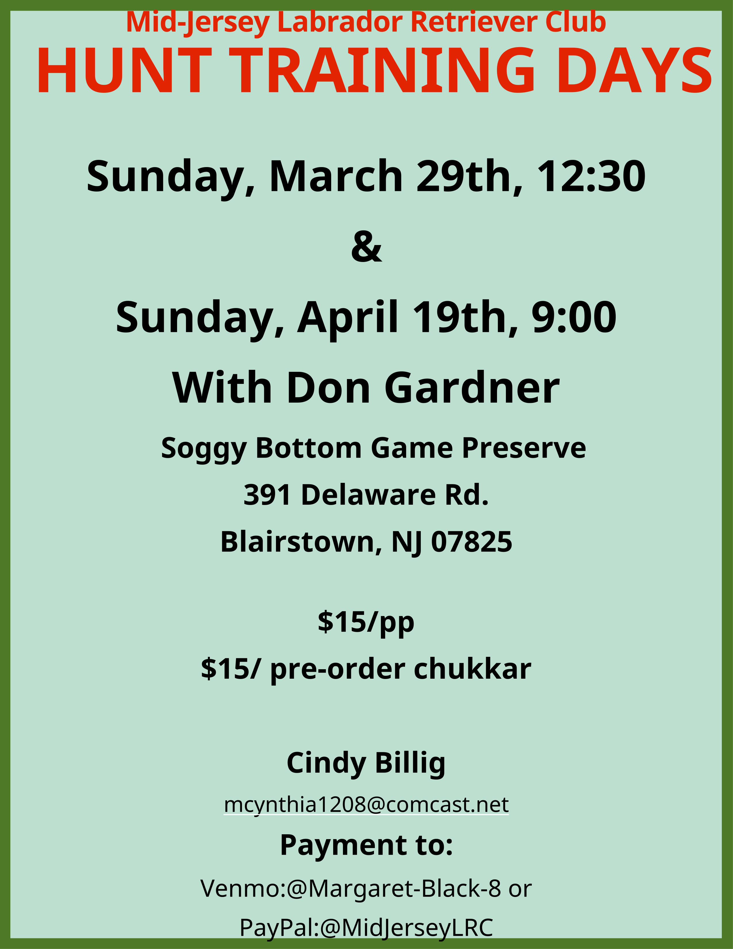 Disclaimer: While this is the official web page for the MJLRC, Inc., there may be errors in the information on these pages. You should contact the club directly for the most up to date information. If you have corrections for any specific errors, you may also contact the webmaster. The Logo and all pictures are copyright by the MJLRC, Inc. or the originating artist and may not be used elsewhere without the Club's permission. Copyright 1998-2024 Mid-Jersey Labrador Retriever Club, Inc. All rights reserved. Feel free to contact us at contact@mjlrc.org or use our contact form.