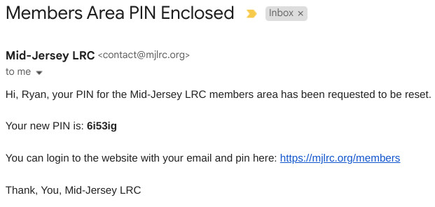 Your email should look similar to this but with your personalized PIN. You can click on the link to https://mjlrc.org/members to open the login page. Use your email address and newly acquired PIN to login to the members area. Remember to use the PIN Login and not the General Login.
