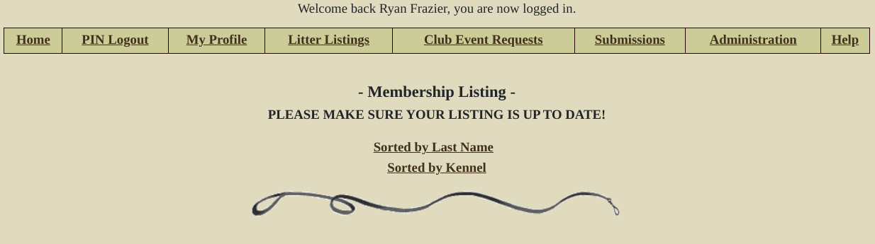 The PIN Login is a new system that gives access to your personal User Profile, the new Litter Listing system (if you have privileges), the Club Event Requests system, Image Submission system, and Administration area (if you have privileges).